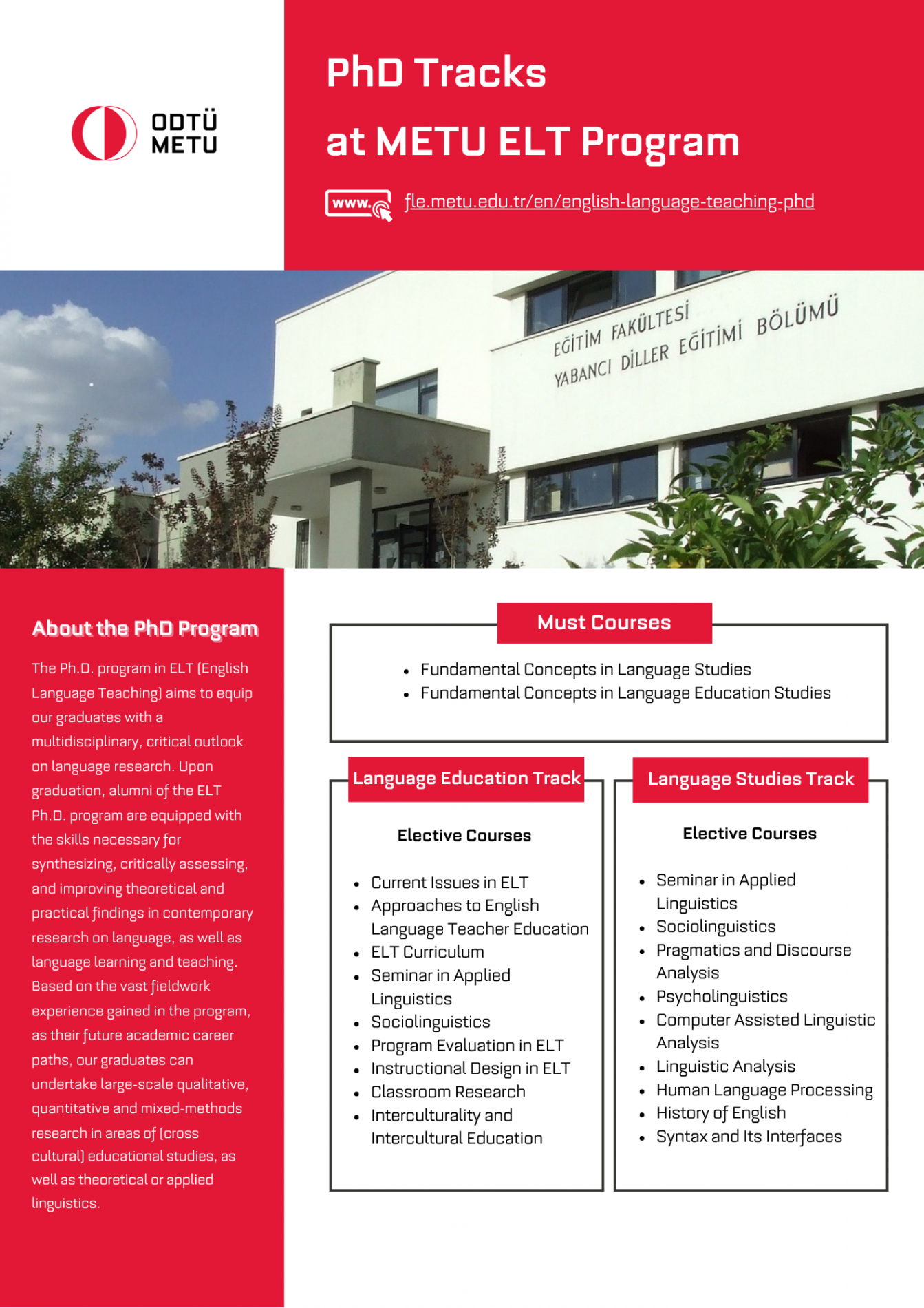 The Ph.D. program in ELT requires students to enroll in either Language Education Track or Language Studies Track based on the interest areas they would like to specialize in.