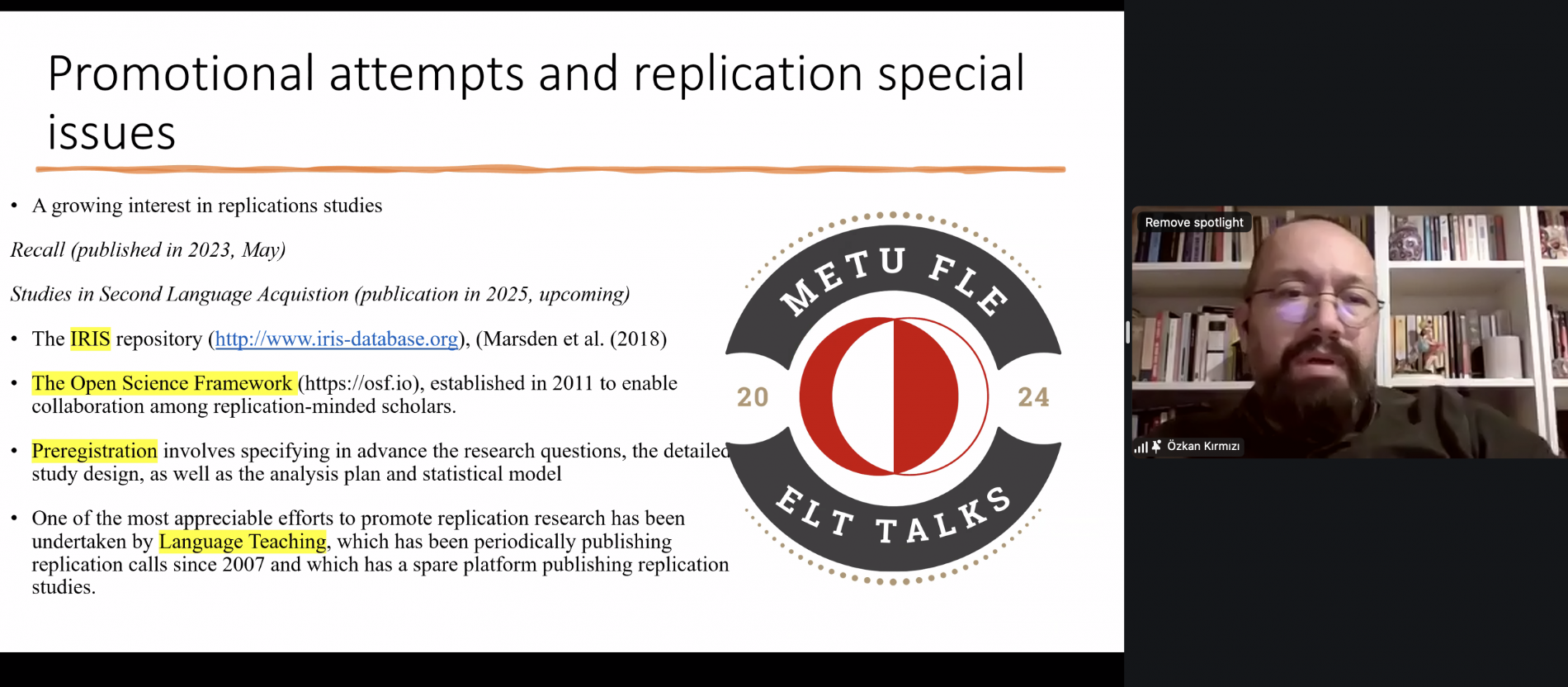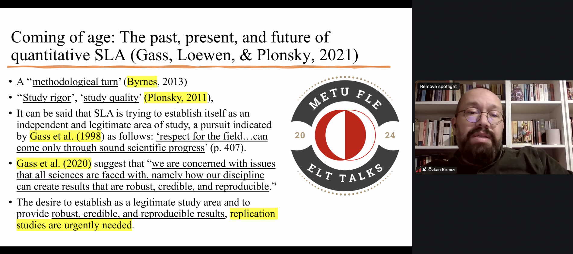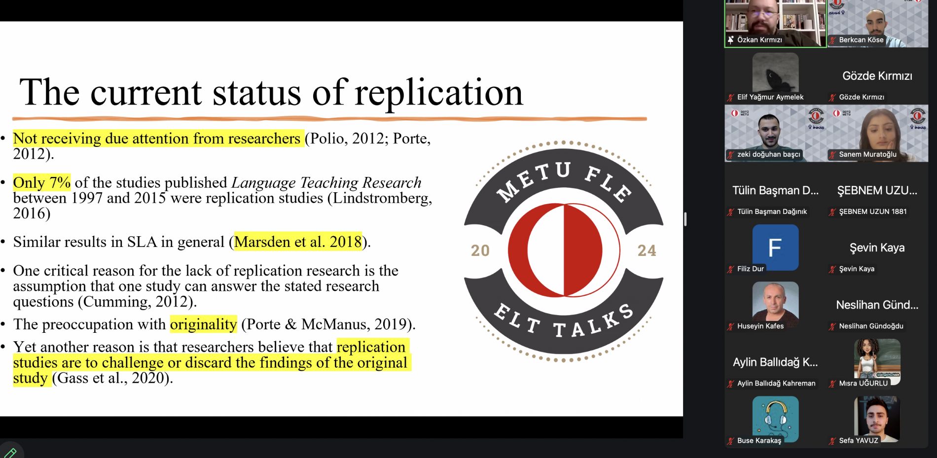 To shift our focus to the current status of replication research, Dr. Kırmızı pointed out that replication studies are still underrepresented in many academic fields, particularly in language teaching and Second Language Acquisition (SLA). He shared pretty surprising data with us, showing that "only 7% of studies published in language teaching research were replication studies," highlighting the limited attention currently received. Dr. Kırmızı explained that the fact that many scholars prioritize originality and novel findings over replication is a significant contributor to the under-representation of replication studies. This tendency is further compounded by the misconception that replication research is about challenging or invalidating the original findings. Quite the contrary, in many cases, replication is conducted to "corroborate the initial findings" and extend the knowledge base.