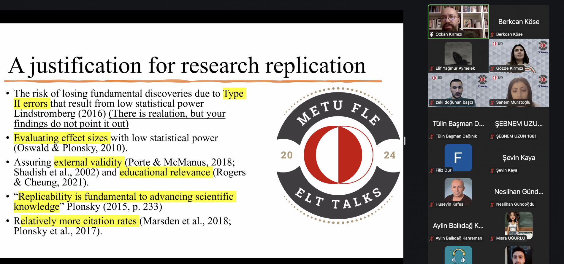 In addition, Prof. Dr. Kırmızı shared practical suggestions for conducting replication research. He advised researchers to ground their studies by clearly explaining why they are replicating a particular study, whether it is to confirm findings, address methodological issues, or expand the existing literature. Dr. Kırmızı also emphasized the importance of labelling replication studies as such, as this helps readers approach the findings with the correct perspective. He suggested that replication studies should always include "the label in the title" so that readers can evaluate the work through the lens of replication.